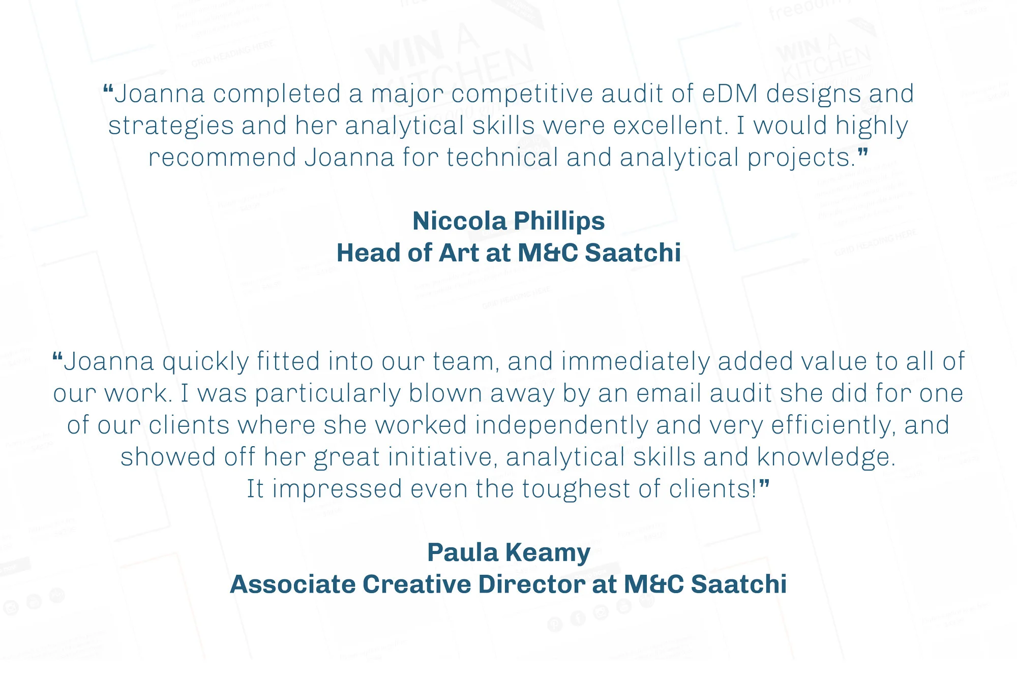 - My analytical work was highly praised by the Head of art and Creative Director, commenting "It impressed even the toughest of clients!"