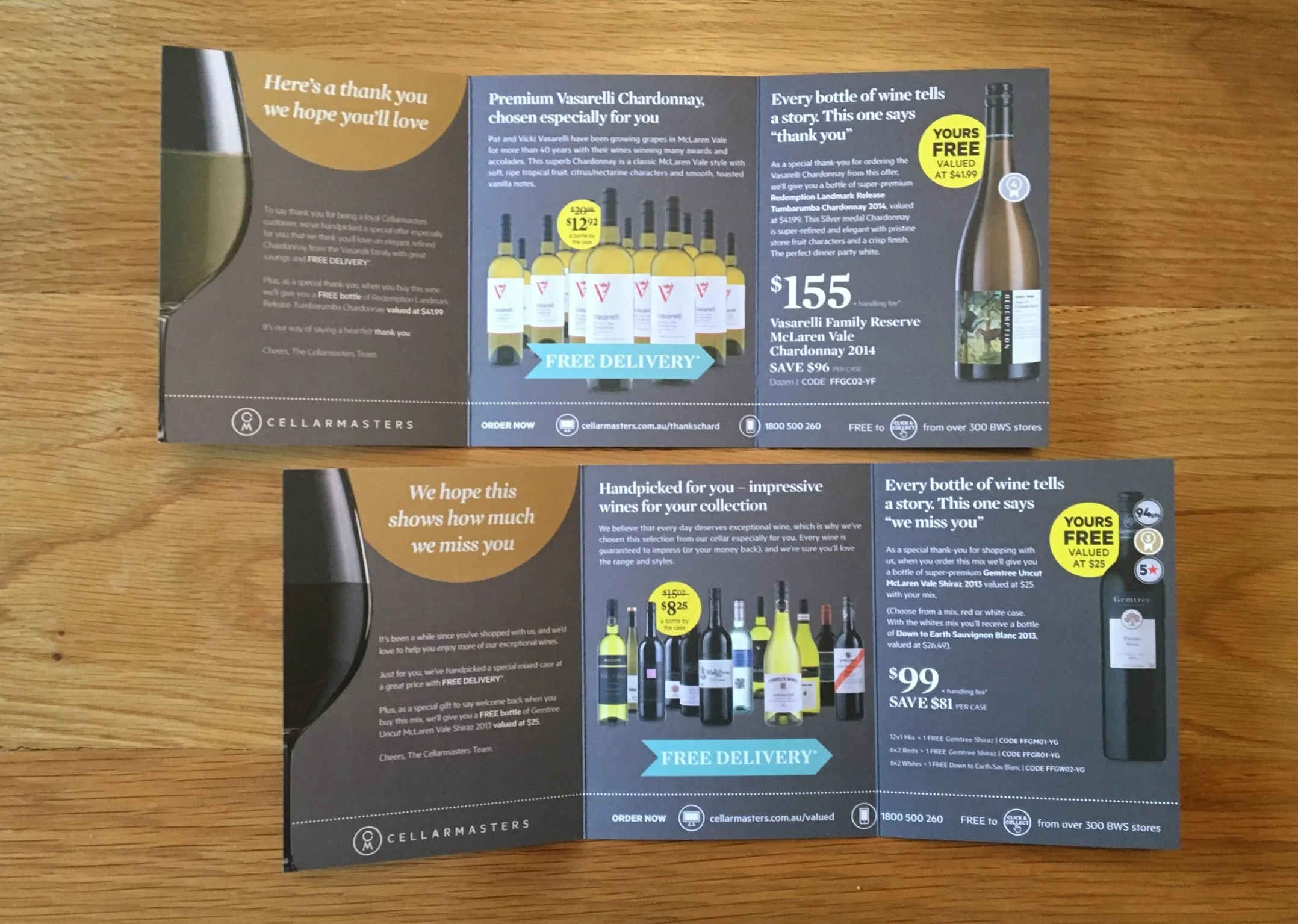 - The marketers wanted to make this piece stand out and be a little bit special, particularly to those who were inactive customers, sending them marketing material by post was a different way to reach out to them. Instead of the yellow circle normally used in the Cellarmasters campaigns, this one used a gold circle with accompanying gold envelope to convey an exclusive and premium feel.