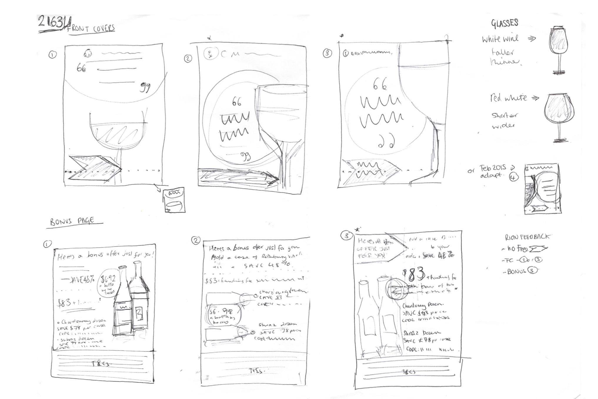 - On the front cover, dependent on the customer's preference (if known) of red or white wine, the glass shape would change! This meant considering carefully the layout of the headline.